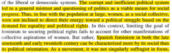 En general los movimientos del feminismo en España estaban más enfocadas en temas sociales y culturales y menos en temas de las políticas; estaban más enfocados en los elementos comunales y menos en los derechos individuales.