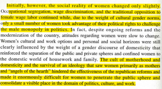Para comenzar el capítulo, Nash habla de tan difícil es discutir los hechos de la resistencia porque muchos documentos estaban destruidos durante la época de Franco. Nash explica que es necesario examinar no sólo los movimientos públicos de las mujeres, como leyes, discursos y políticas pero también la vida cotidiana de la mujer en los lugares públicos *y* privados, para comparar las ideales con la realidad. Ella dice que el movimiento de feminismo no es lineal pero un proceso y patrón del cambio en un contexto y una consciencia sociocultural específico a su lugar y época (Nash 47). Con el surgimiento de la Segunda República, hubo cambios para las mujeres en sectores públicas, pero en realidad, había poco cambio debido a la culta de domesticidad y maternidad.